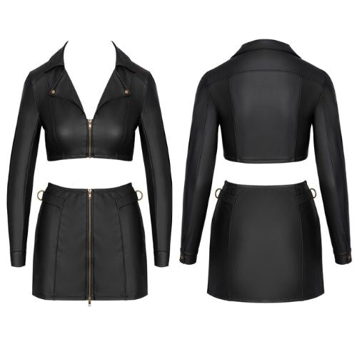 Designed to make a statement, this matte black ensemble includes a short, curve-hugging jacket top and a sleek mini skirt that dares to play with temptation. The soft, stretchy, wetlook material molds to your body, accentuating every contour.