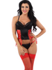 Crafted from satin feel fabric, this black basque features slightly padded cups trimmed with lace. Show just a hint of skin with the bodice's cutouts and red ribbon ties.